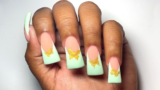 І якби ж тільки це! Зазвичай прихильниці качиних нігтів не обмежуються лише формою, а й щедро декорують свій манікюр. Наприклад, отак...