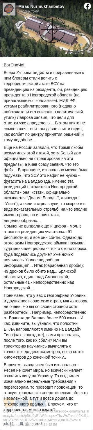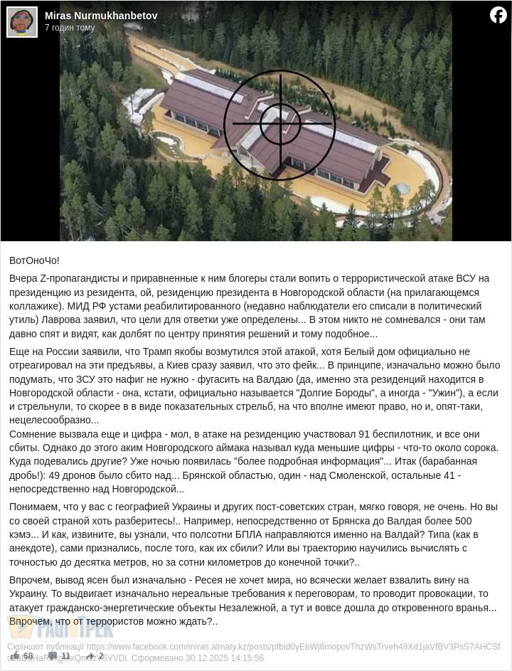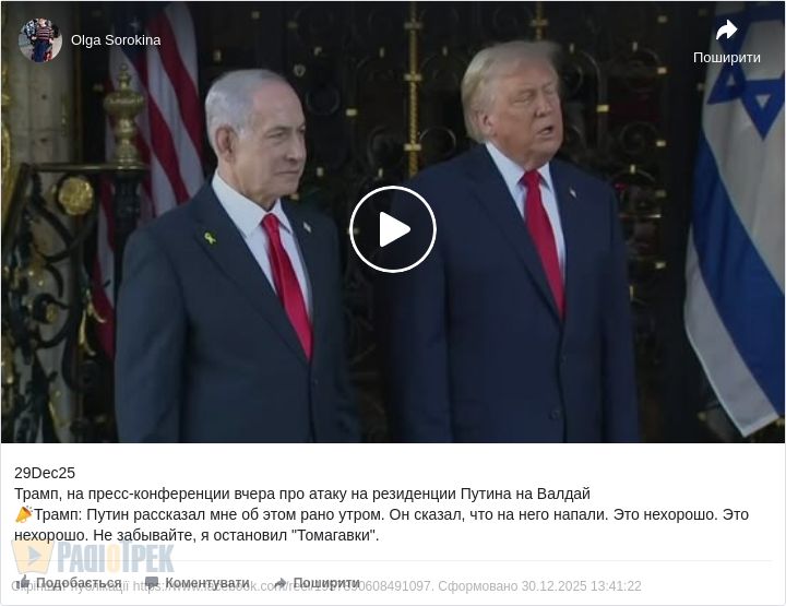 Не можна виключати, що байка про начебто атаку 91-го БПЛА на дачу Путіна у Валдаї була погоджена між Кремлем та Білим Домом заздалегідь. Не виключено, що в окремій закулісній телефонній розмові між Ушаковим та Віткоффом.