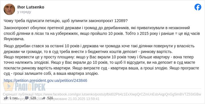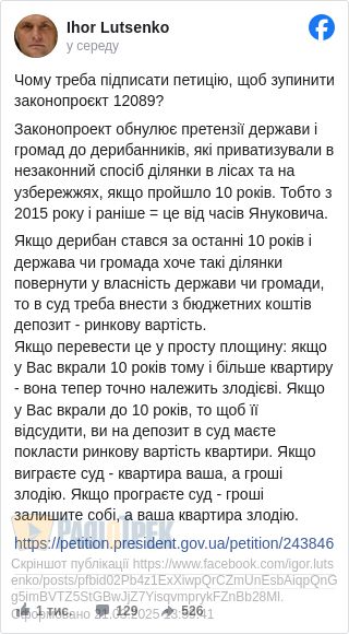 «Якщо перевести це у прості слова: якщо у вас вкрали квартиру 10 років тому або більше – вона тепер точно належить злодію. Якщо у вас вкрали квартиру менш ніж 10 років тому, то щоб її відсудити, ви повинні покласти на депозит у суд її ринкову вартість. Якщо виграєте суд – квартира ваша, а гроші отримає злодій. Якщо програєте – гроші залишаться у вас, а ваша квартира залишиться злодію», – зазначив Ігор Луценко.
