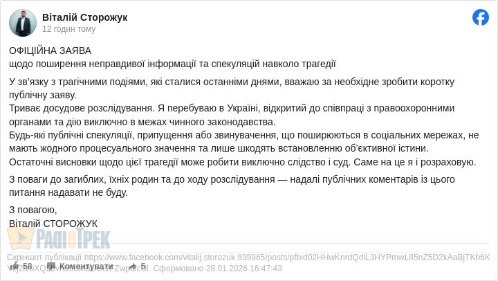 Будь-які публічні спекуляції, припущення або звинувачення, що поширюються в соціальних мережах, не мають жодного процесуального значення та лише шкодять встановленню об’єктивної істини.