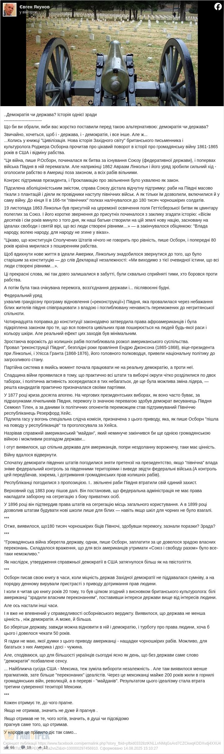Нижче подаємо роздуми Євгена Якунова, який цікаво проводить паралель між Україною та певним періодом в історії США.