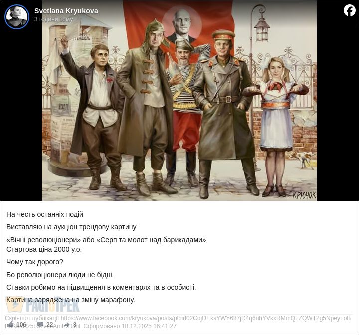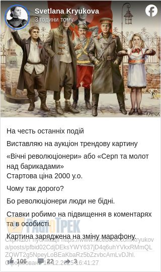 P.S. На момент публікації цього матеріалу (о 16.00) картину «про революціонерів» вже були готові купити у Крюкової з $2500