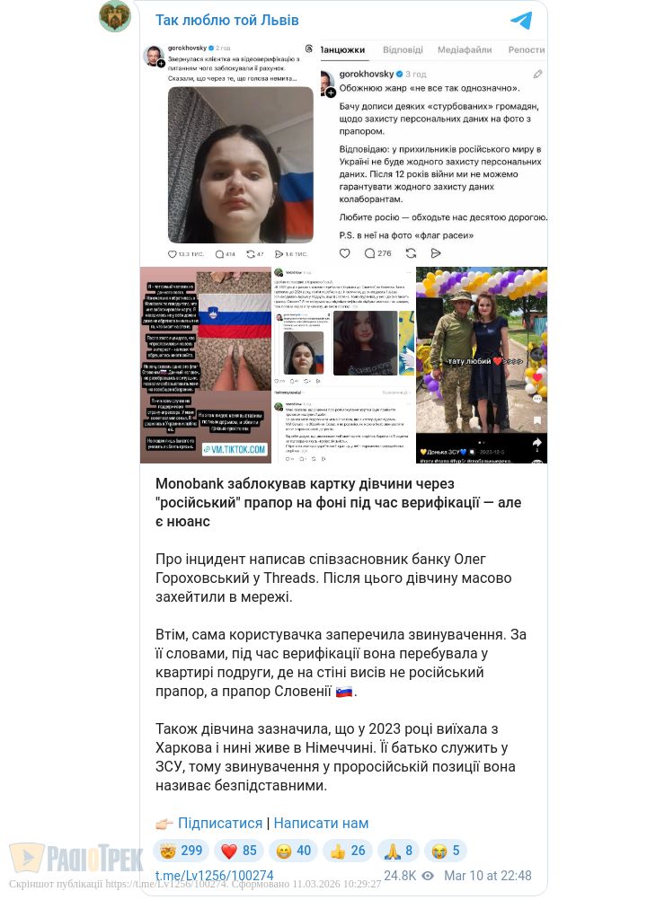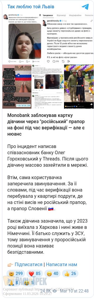 Monobank заблокував картку дівчини через «російський» прапор на фоні під час верифікації особи, як того вимагає процедура Монобанку.
