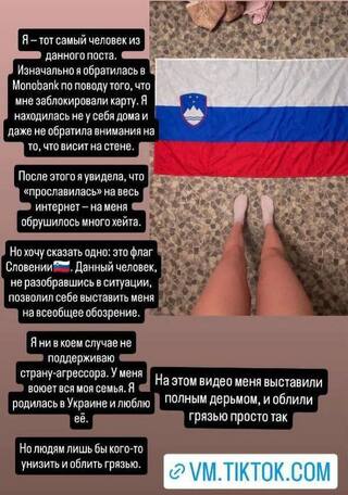 За її словами, під час верифікації вона перебувала у квартирі подруги, де на стіні висів не російський прапор, а прапор Словенії, який загалом є подібним до прапору РФ.