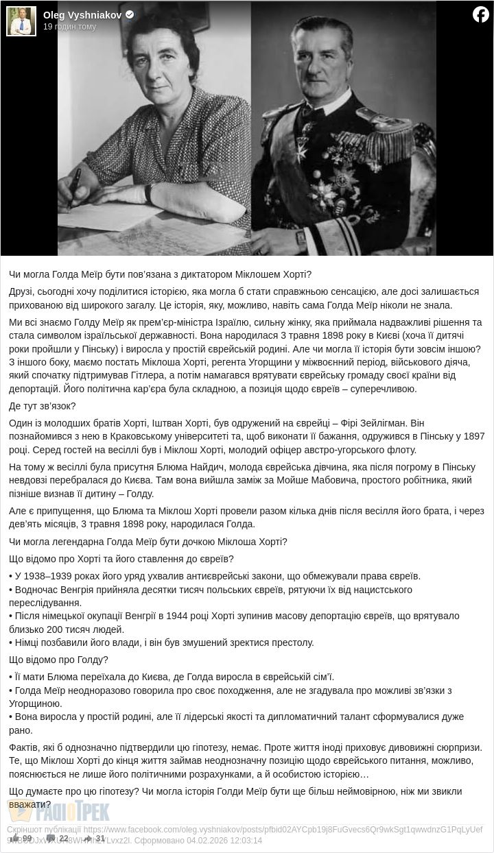 Чи могла Голда Меїр бути пов’язана з диктатором Міклошем Хорті?
