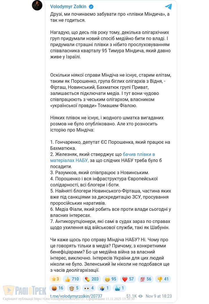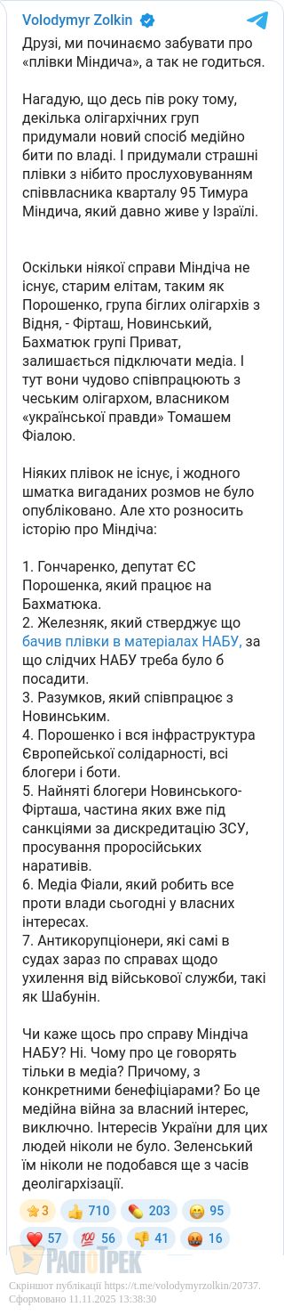 Для певного балансу треба, все ж, мати на увазі, що жодної справи конкретно проти Тимура Міндіча … НЕ ВІДКРИТО