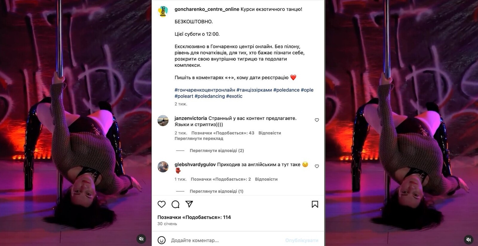 Як стверджує «Рух Чесно», в центах ім. Гончаренка людей залучають обіцянками навчити їх танцювати на пілонах.