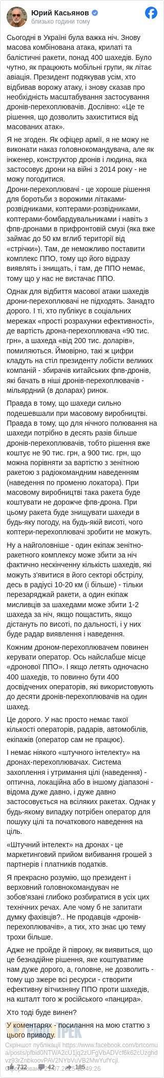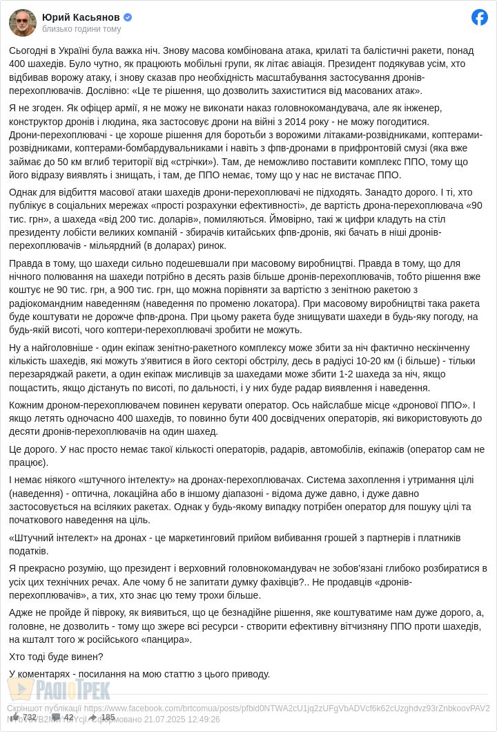 Адже не пройде й півроку, як виявиться, що це безнадійне рішення, яке коштуватиме нам дуже дорого, а, головне, не дозволить - тому що зжере всі ресурси – створити ефективну вітчизняну ППО проти шахедів, на кшталт того ж російського «панцира».