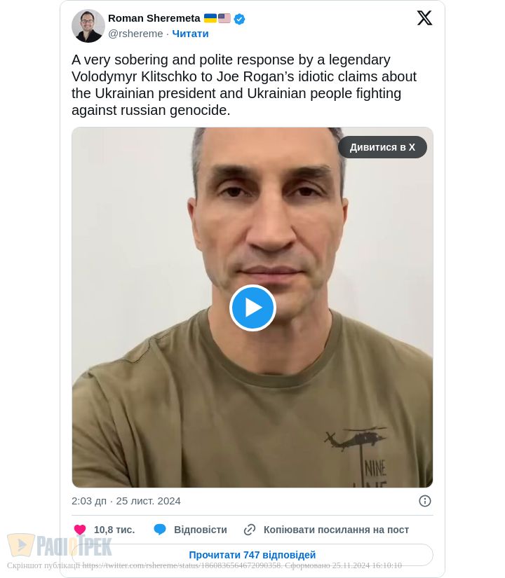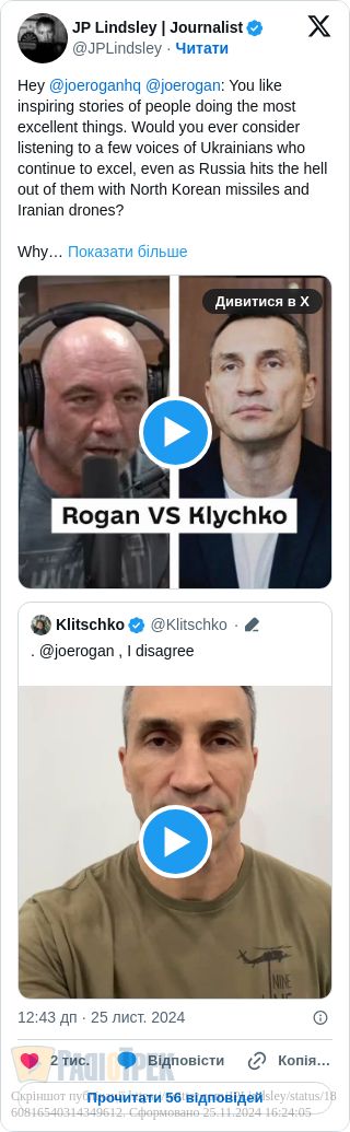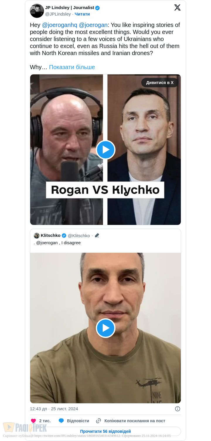 «Джо Роган, я прослухав твій останній подкаст. Надсилаю тобі це відео, щоб ти знав, що я не погоджуюся.