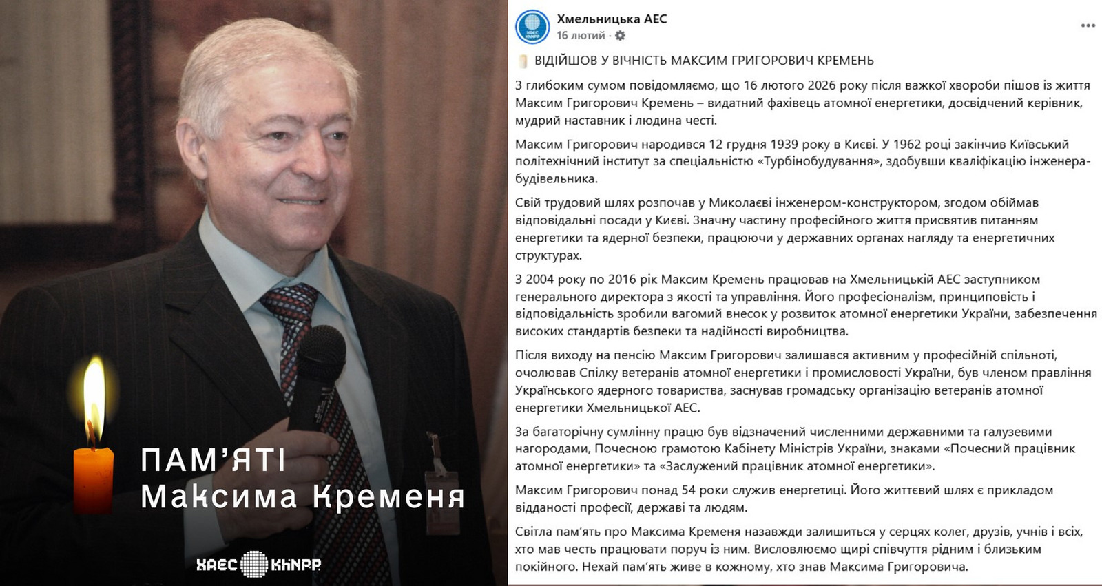 На жаль, у лютому 2026 року Максима Григоровича Кременя не стало.