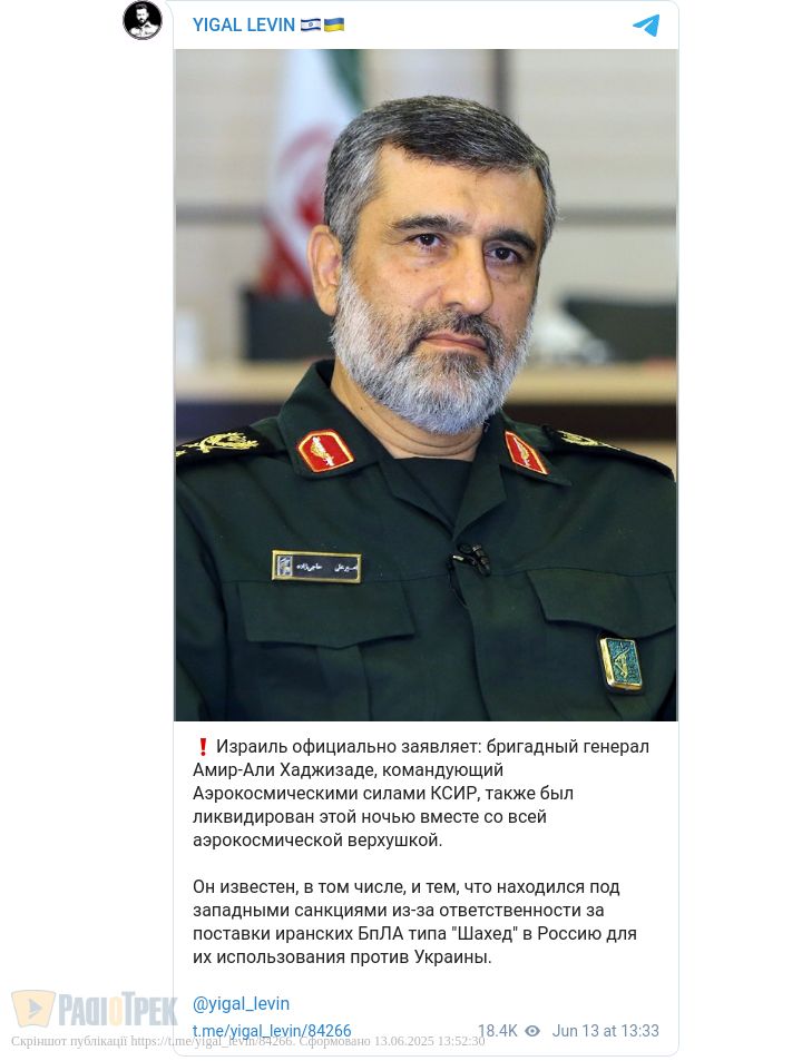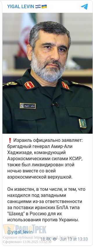 - Іран позбувся такої ключової фігури, як командувач КВІР — Генерал-майора Хосейн Саламі, він керував усіма підрозділами країни.