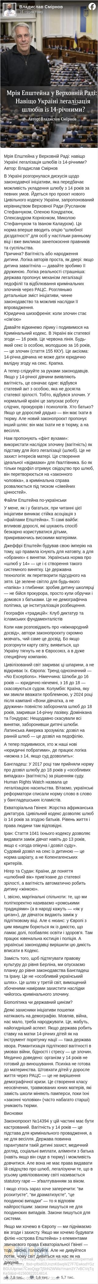 У мене, як і у багатьох, при читанні цієї ініціативи виникає стійка асоціація з «файлами Епштейна». Ті самі вайби: впливові дорослі, які шукають спосіб безкарно користуватися дітьми, прикриваючись високими матеріями.