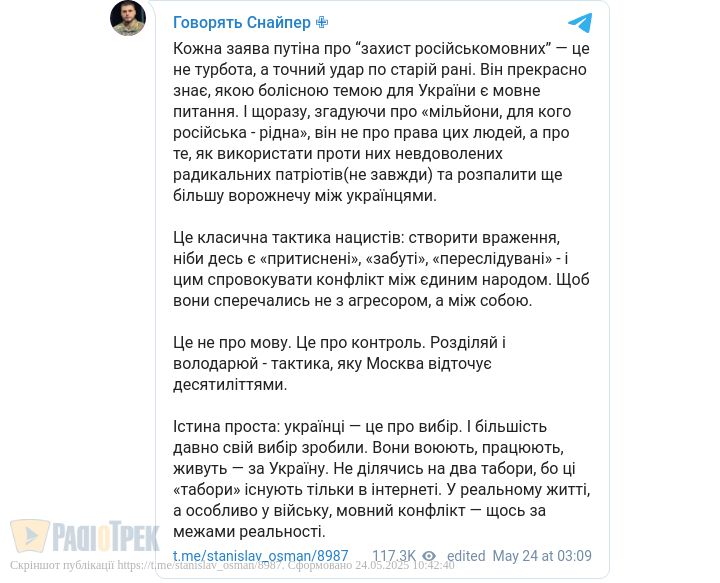 Свіжий допис «Османа» стосується Путіна та «мовного вопроса», яким ворог намагається нас розколоти: