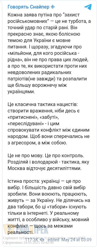 Кожна заява путіна про «захист російськомовних» — це не турбота, а точний удар по старій рані.