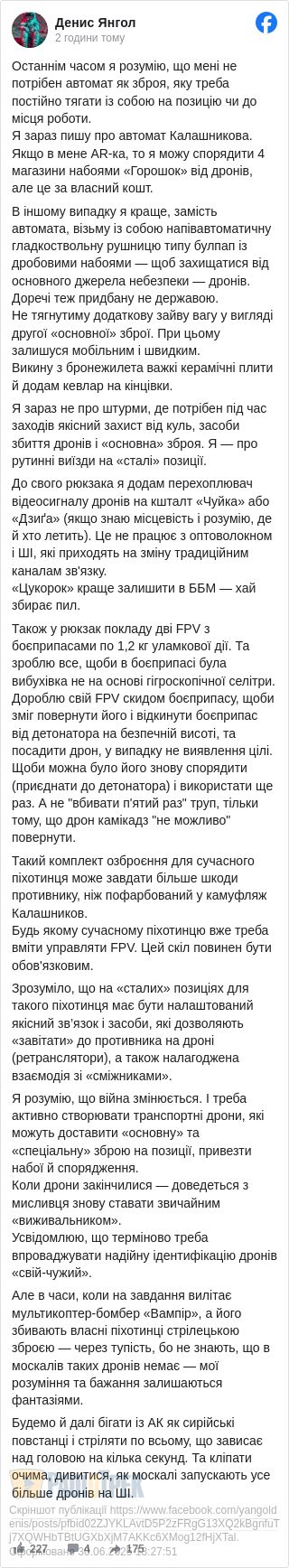 Але в часи, коли на завдання вилітає мультикоптер-бомбер «Вампір», а його збивають власні піхотинці стрілецькою зброєю – через тупість, бо не знають, що в москалів таких дронів немає – мої розуміння та бажання залишаються фантазіями.