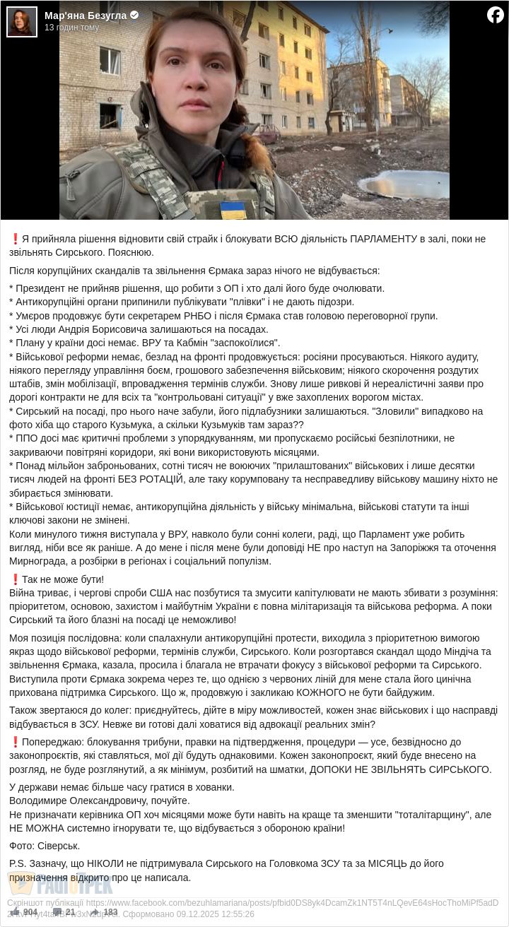Прийняла рішення відновити свій страйк і блокувати ВСЮ діяльність ПАРЛАМЕНТУ в залі, поки не звільнять Сирського. Пояснюю.