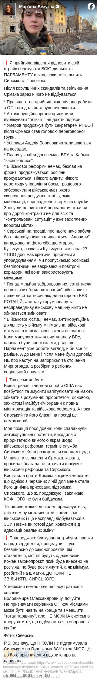 Принаймні Мар’яна Безугла в цьому плані є непохитною: закликає до відставки Сирського, повної мілітаризації всього суспільного життя та реформи ЗСУ, де вже 1 000 000 (мільйон) військових сидить на тилових посадах, в той час, як фронт тримають на собі – весь час – одні й ті ж самі герої.