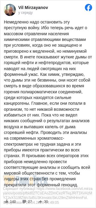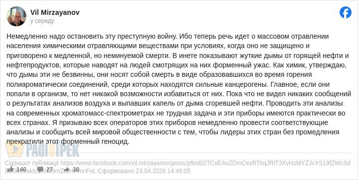 Не бачив допоки жодних повідомлень про результати аналізів повітря і крапель, що випали від диму згорілої нафти.
