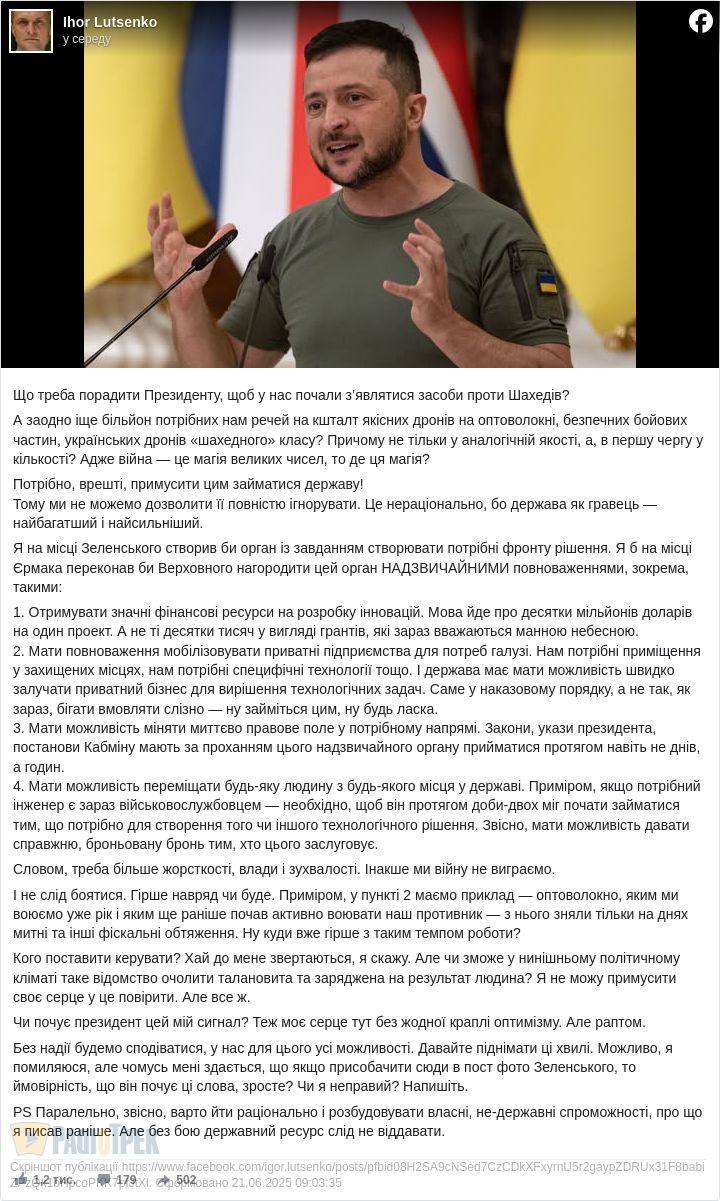 - Що треба порадити Президенту, щоб у нас почали з’являтися засоби проти Шахедів? А заодно іще більйон потрібних нам речей на кшталт якісних дронів на оптоволокні, безпечних бойових частин, українських дронів «шахедного» класу? Причому не тільки у аналогічній якості, а, в першу чергу у кількості?