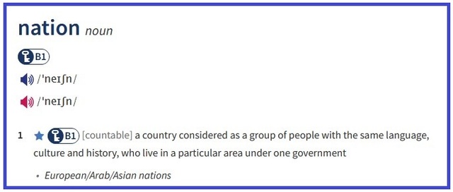 Нація – країна, що розглядається як група людей з однаковою мовою, культурою та історією, які проживають на певній території під управлінням одного уряду