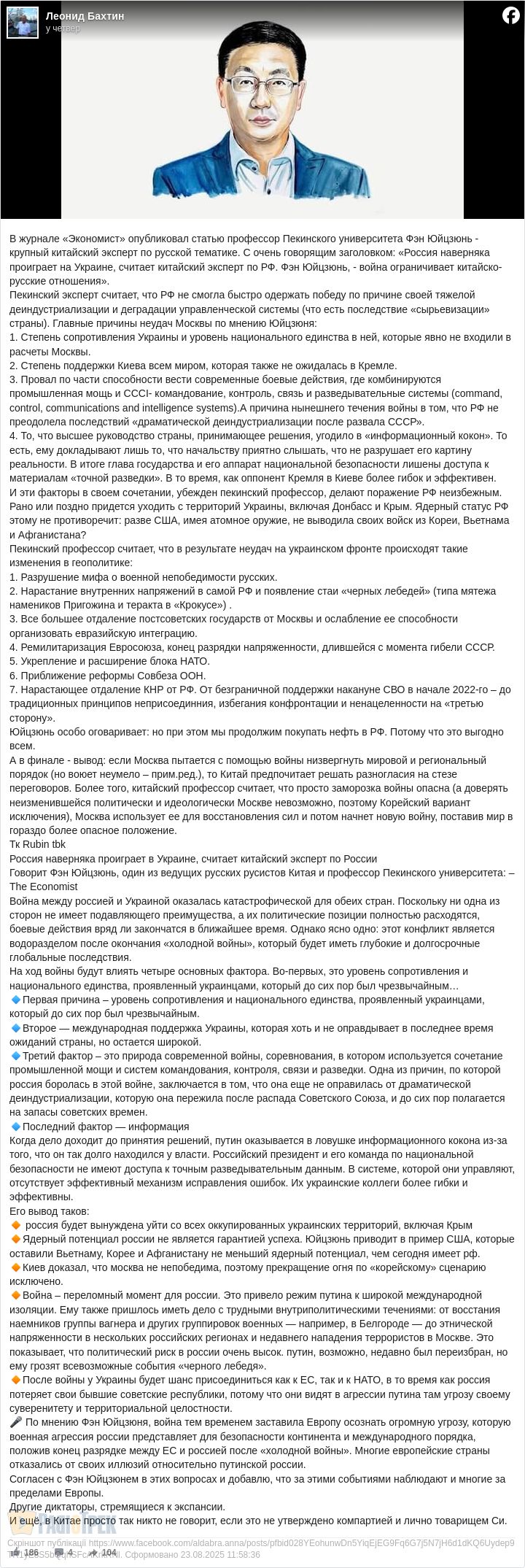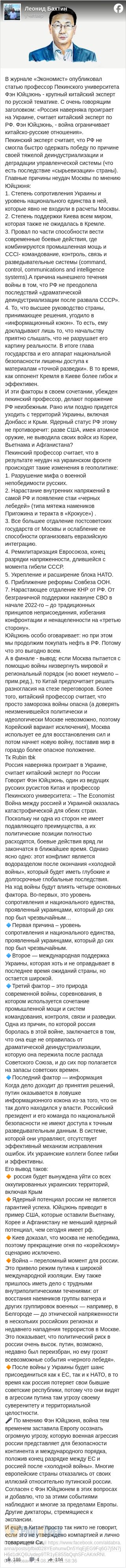 Ще в минулому році цей викладач Пекінського університету опублікував у британському журналі «The Econimist» резонансний матеріал, в якому навів чотири аргументи на користь того, того, що РФ програє:
