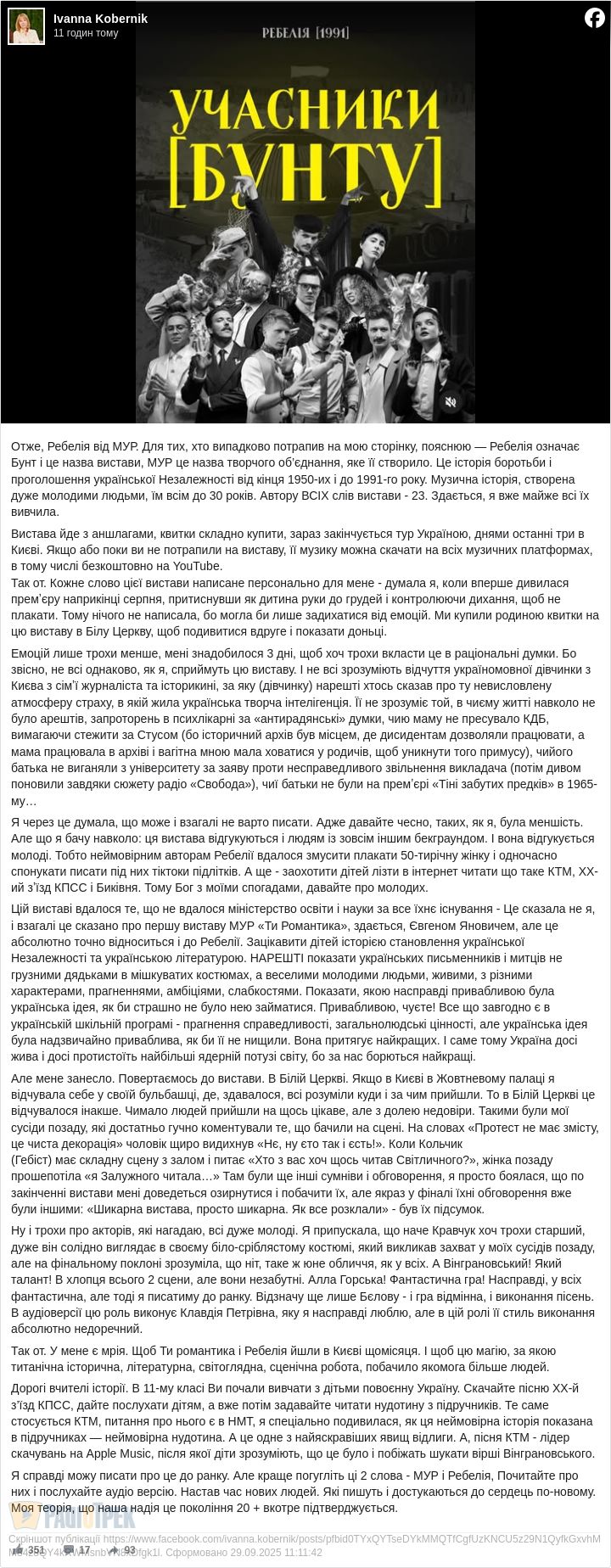 Бо звісно, не всі однаково, як я, сприймуть цю виставу. І не всі зрозуміють відчуття україномовної дівчинки з Києва з сімʼї журналіста та історикині, за яку (дівчинку) нарешті хтось сказав про ту невисловлену атмосферу страху, в якій жила українська творча інтелігенція.