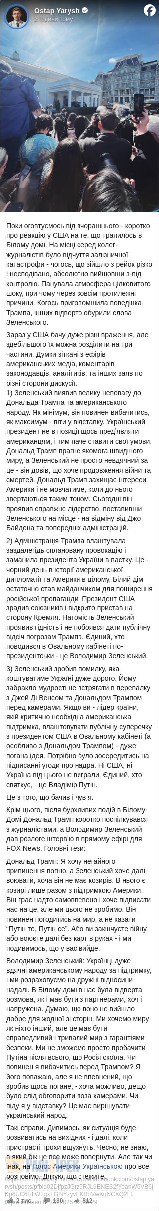 - Адміністрація Трампа влаштувала заздалегідь сплановану провокацію і заманила президента України в пастку. Це - чорний день в історії американської дипломатії та Америки в цілому. Білий дім остаточно став майданчиком для поширення російської пропаганди. Президент США зрадив союзників і відкрито пристав на сторону Кремля. Натомість Зеленський проявив гідність і не побоявся дати публічну відсіч погрозам Трампа. Єдиний, хто поводився в Овальному кабінеті по-президентськи - це Володимир Зеленський.