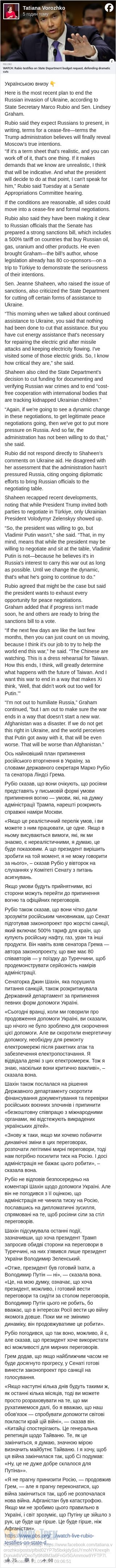 Рубіо не відповів безпосередньо на коментарі Шахін щодо допомоги Україні. Але він не погодився з її оцінкою, що адміністрація не чинила тиску на Росію, пославшись на дипломатичні зусилля, спрямовані на те, щоб росіяни сіли за стіл переговорів.