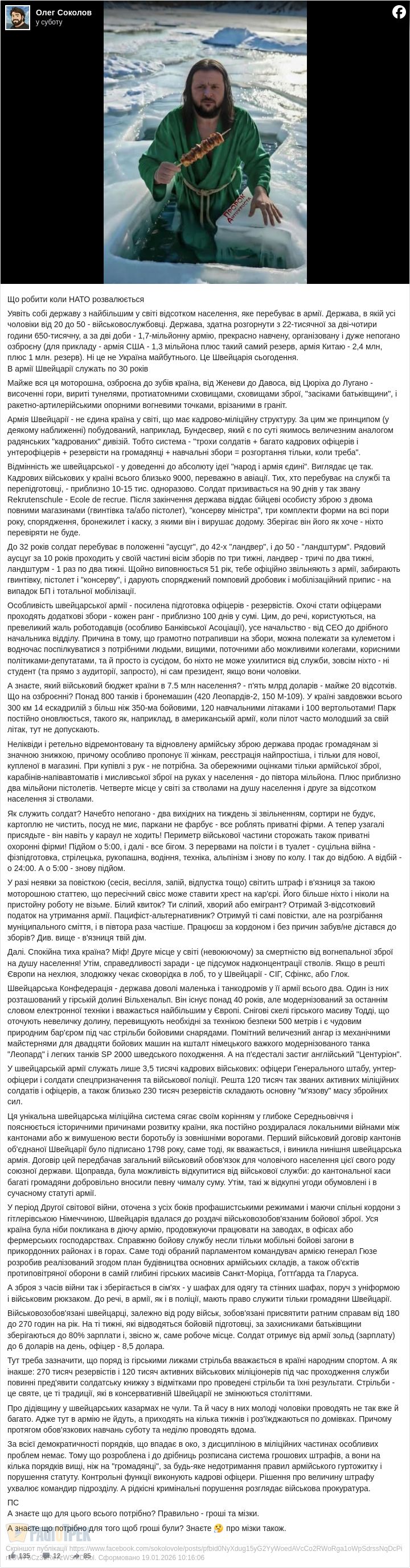 Нині ж пропонуємо цікавий матеріал від Олега Соколова, який докладно описує схему функціонування «Швейцарського війська». Схему, яка теж передбачає – тотальне залучення ВСІХ чоловіків, але…