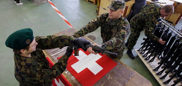 У період Другої світової війни, оточена з усіх боків профашистськими режимами і маючи спільні кордони з гітлерівською Німеччиною, Швейцарія вдалася до роздачі військовозобов'язаним бойової зброї.