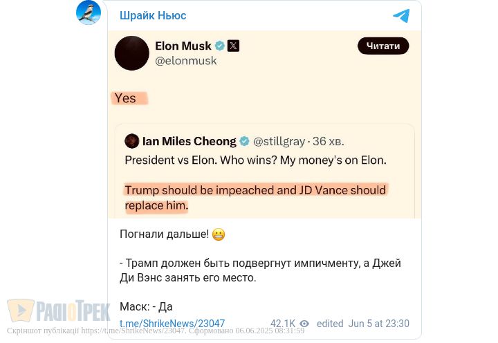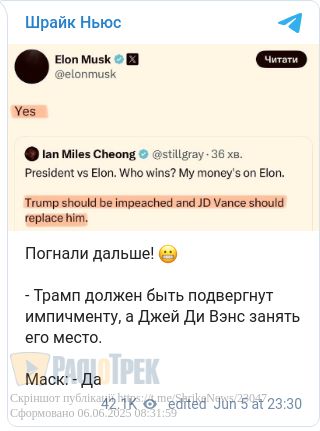 Історія не обмежилася лише цими заявами. Надвечір Трамп виклав у соцмережі допис, де заявив, що Маск «зʼїхав з глузду».