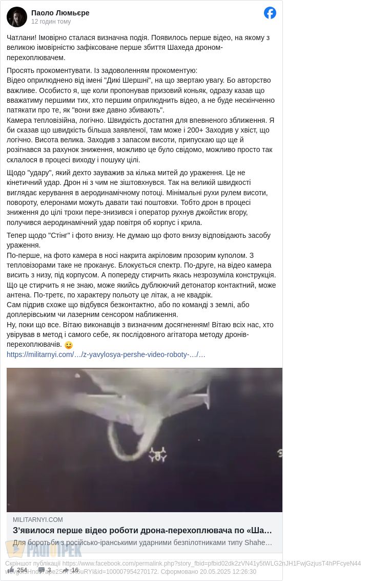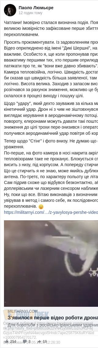 Свіжий допис на тему «Шахедів» зробив і військовий оглядач Паоло Лум'єре, реагуючи на заяву начальника управління комунікацій командування Повітряних сил ЗСУ Юрія Ігната щодо чергової атаки «Шахедів», багато з яких залишилися незбитими.