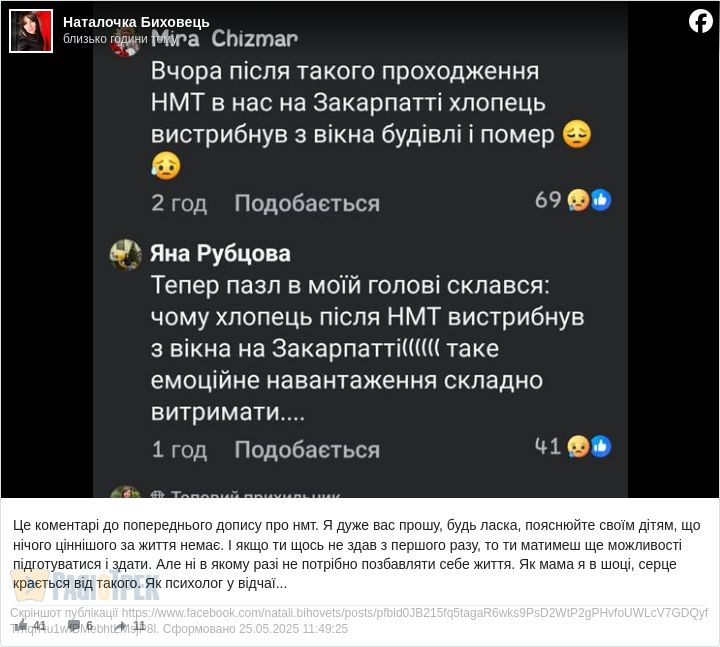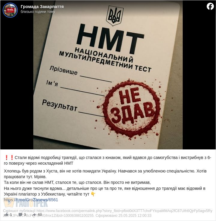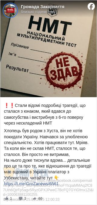 16-річного хлопця, який наклав на себе руки після 4-годинного НМТ, бо, начебто, вважав, що здати цей тест йому не вдалося.