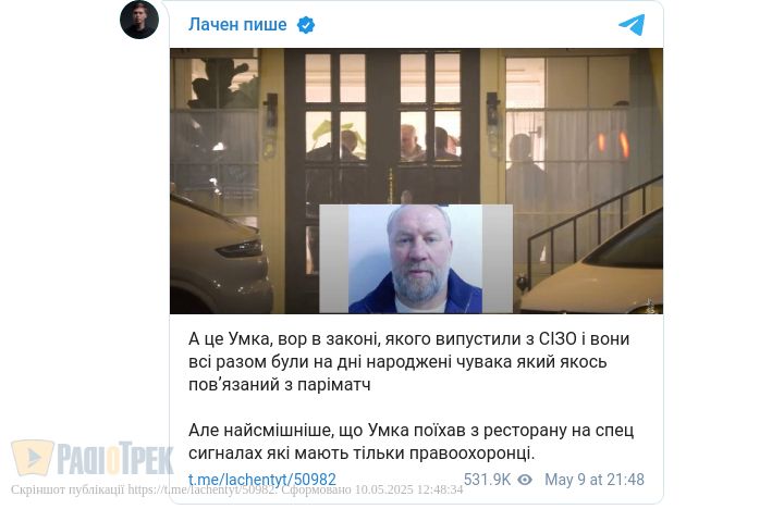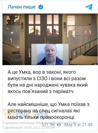- Бандит «Умка» був затриманий і 13 місяців провів у слідчому ізоляторі, президент наклав на нього санкції. Але зараз «Умка» вільно пересувається Києвом на машині із спецномерами, які видають виключно правоохоронні органи, та з великою охороною.