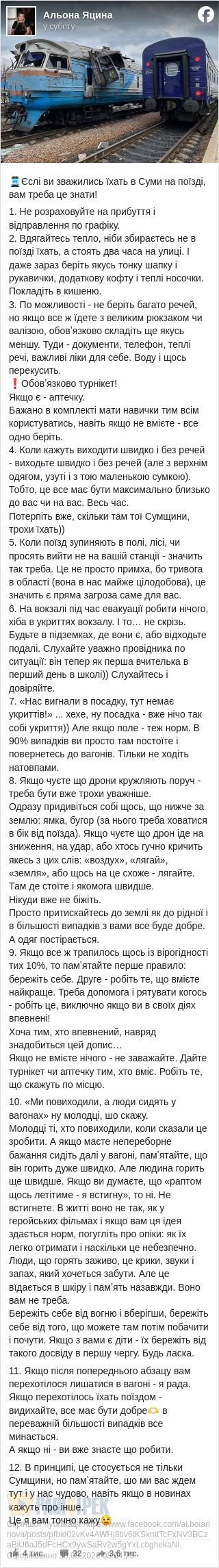- Коли поїзд зупиняють в полі, лісі, чи просять вийти не на вашій станції - значить так треба. Це не просто примха, бо тривога в області (вона в нас майже цілодобова), це значить є пряма загроза саме для вас.