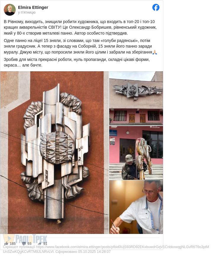 У Рівному, виходить, знищили робити художника, що входить в топ-20 і топ-10 кращих акварельністів СВІТУ! Це Олександр Бобришев, рівненський художник, який у 80-х створив металеві панно.