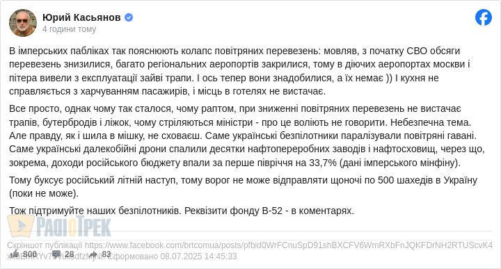 Це справжній транспортний колапс – затримані та скасовані рейси вже просто нікуди вписати в щільний розклад, в аеропортах скупчилися десятки тисяч пасажирів, які сплять прямо на підлозі і не можуть навіть замовити таксі до готелю, тому що мобільний інтернет теж не працює – по всій імперії тотальні відключення мобільного інтернету і вже навіть мобільного зв'язку через загрозу застосування українськими дронами стільникової мережі для управління і наведення на ціль.