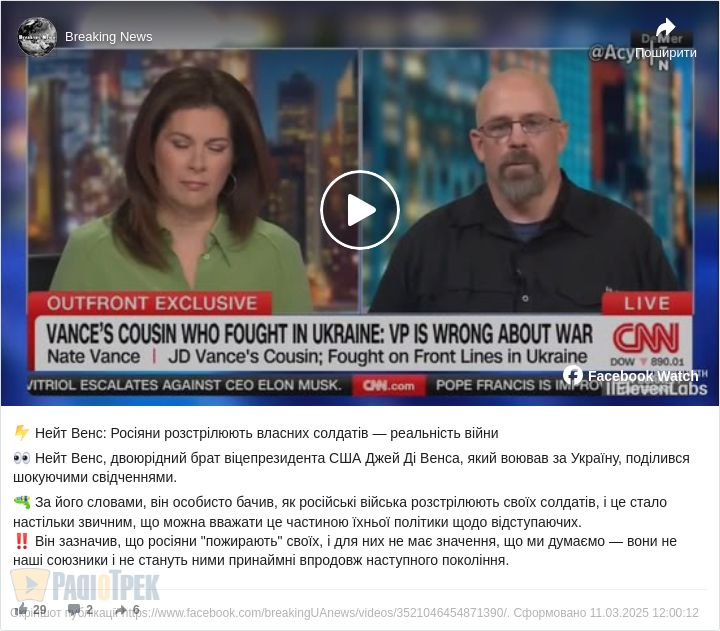 У свіжому інтерв’ю для CNN двоюрідний брат діючого віце-президента США розказує про побачене ним на фронті і висловлює певність, що Росіє є ворожою до Америки політичною системою.