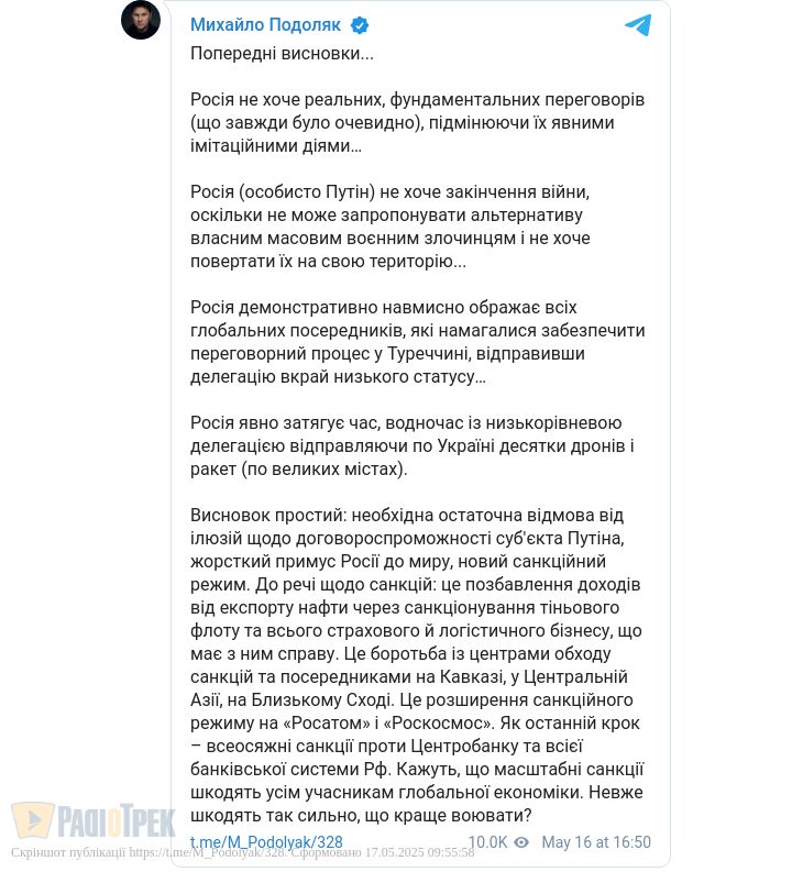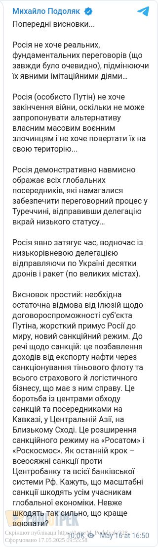 - Росія не хоче реальних, фундаментальних переговорів (що завжди було очевидно), підмінюючи їх явними імітаційними діями…
