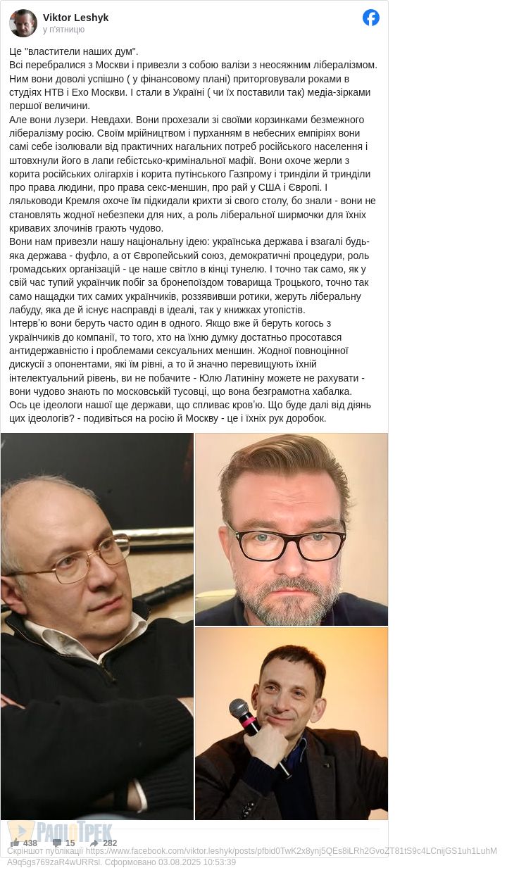 Учора ж відомий український журналіст, експерт та викладач Віктор Лешик звернув увагу на деяких «стовпів» цього доволі характерного пропагандивного потоку в Україні.