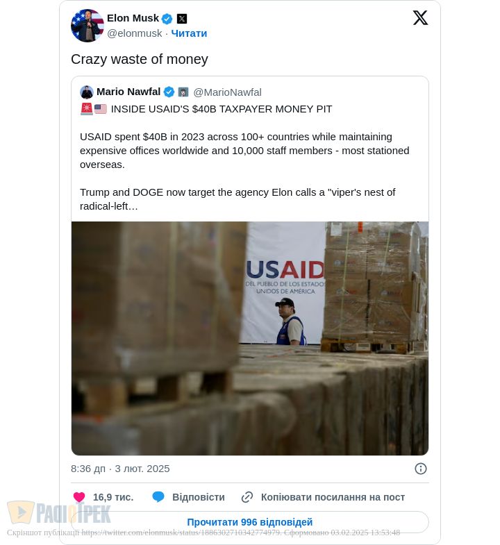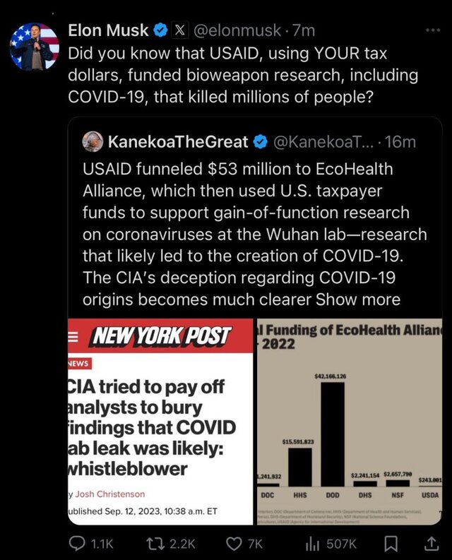 Раніше Маск також прямо звинуватив USAID у фінансуванні розробки вірусу COVID 19