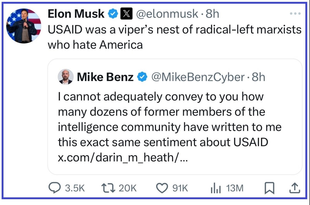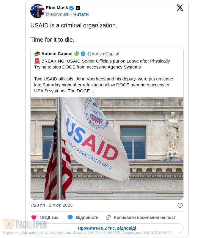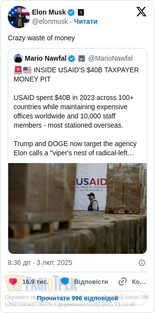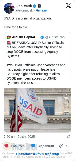 Ілон Маск, який зараз очолює Міністерство ефективності уряду (DOGE), заявив на платформі X, що вони працюють над закриттям Агентства США з міжнародного розвитку (USAID).