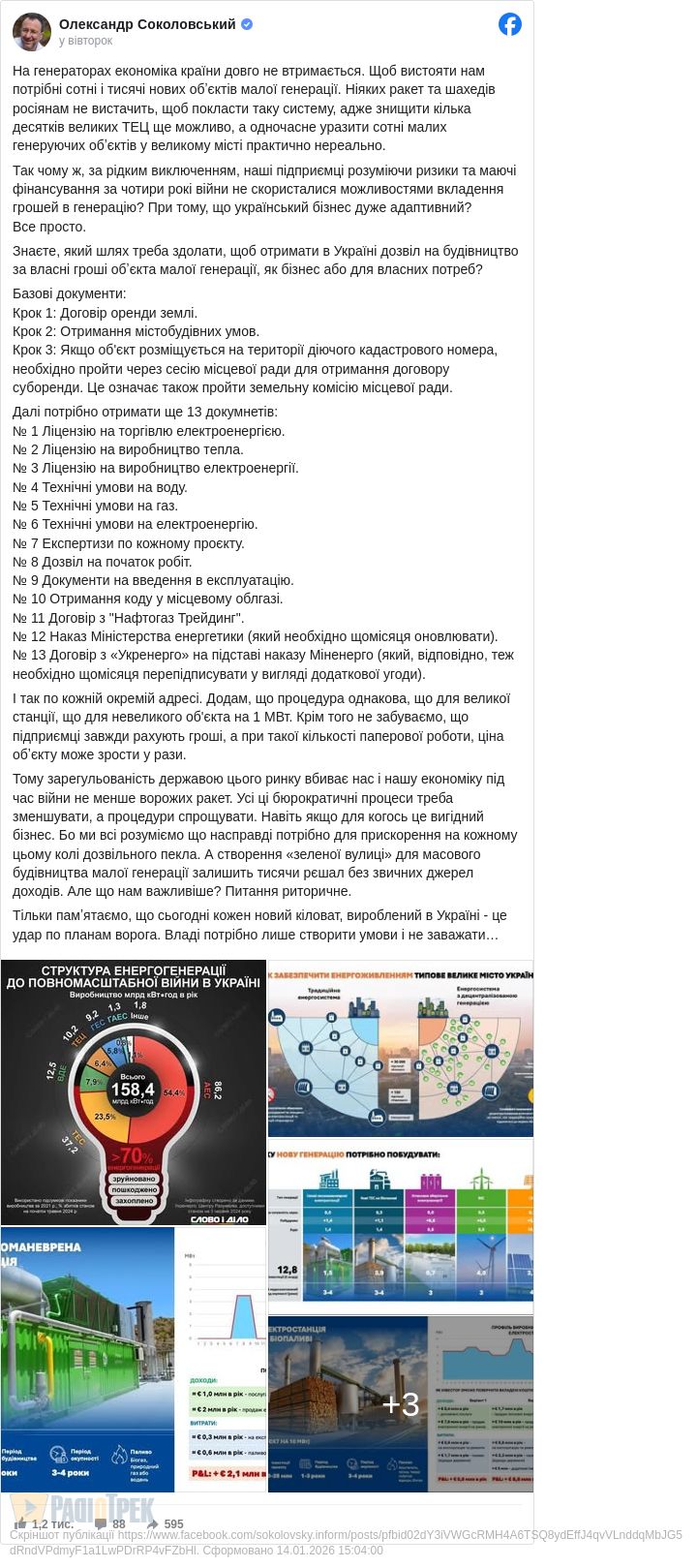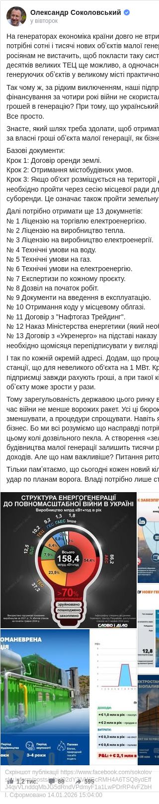 - На генераторах економіка країни довго не втримається. Щоб вистояти нам потрібні сотні і тисячі нових обʼєктів малої генерації.