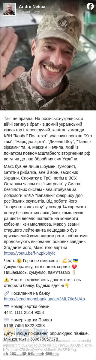 Макс був не лише шоумен, гуморист, затятий рибалка, але й воїн, захисник України. Спочатку в ТрО, потім в ЗСУ.