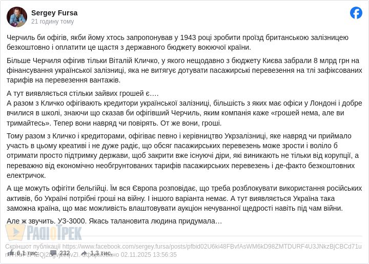 «Черчилль би офігів»: Фурса проти «УЗ – 3000» й закликає підняти вартість квитків (ФОТО)
