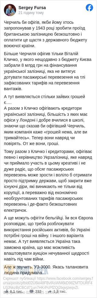 Натомість Сергій Фурса – економіст, якого дехто вважає представником інтересів Джорджа Сороса в Україні, різко розкритикував ініціативу Зеленського та весь проект «УЗ – 3000», закликавши у свідки самого Вінстона Черчилля.