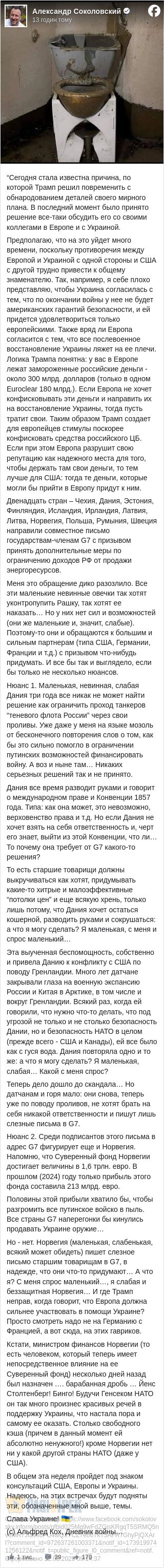 Логика Трампа понятна: у вас в Европе лежат замороженные российские деньги - около 300 млрд. долларов (только в одном Euroclear 180 млрд.). Если Европа не хочет конфисковывать эти деньги и направить их на восстановление Украины, тогда пусть тратит свои.
