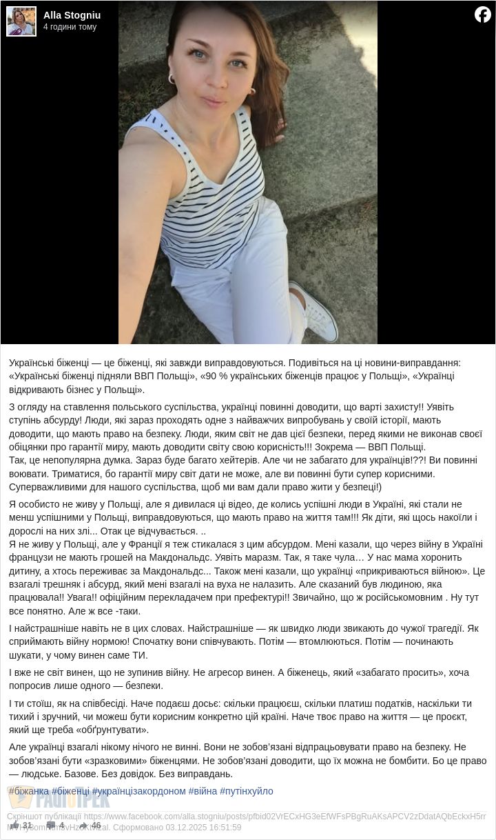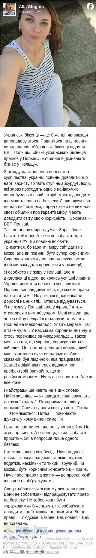 Alla StogniuУкраїнські біженці – це біженці, які завжди виправдовуються.