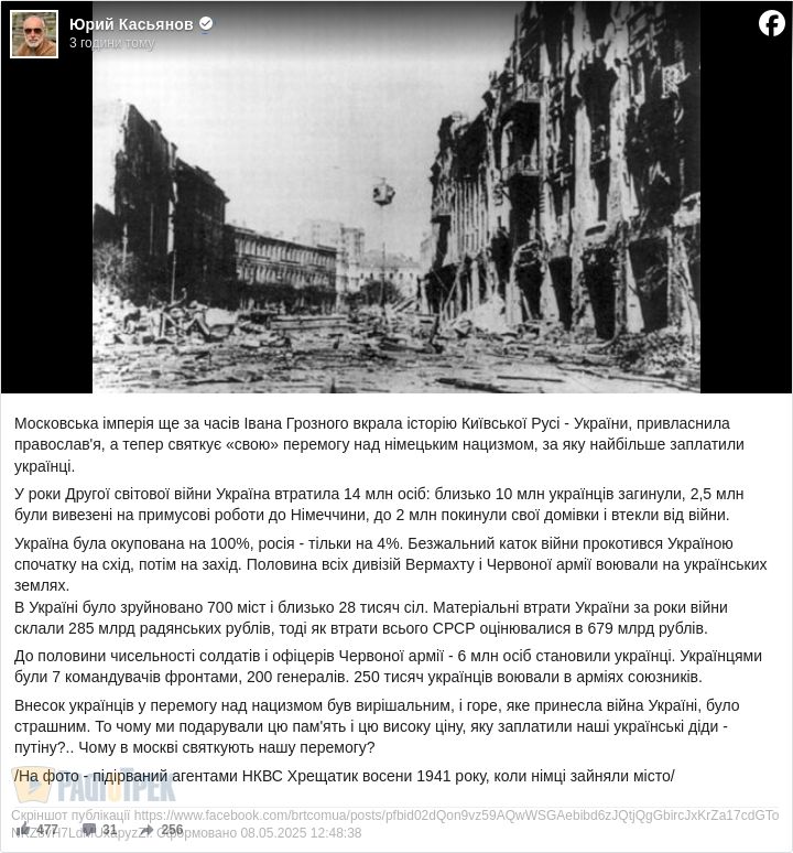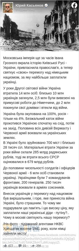 Московська імперія ще за часів Івана Грозного вкрала історію Київської Русі – України, привласнила православ'я, а тепер святкує «свою» перемогу над німецьким нацизмом, за яку найбільше заплатили українці.