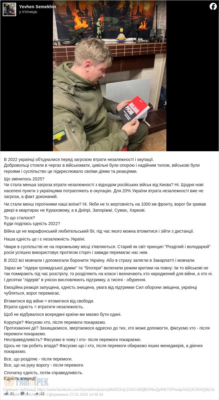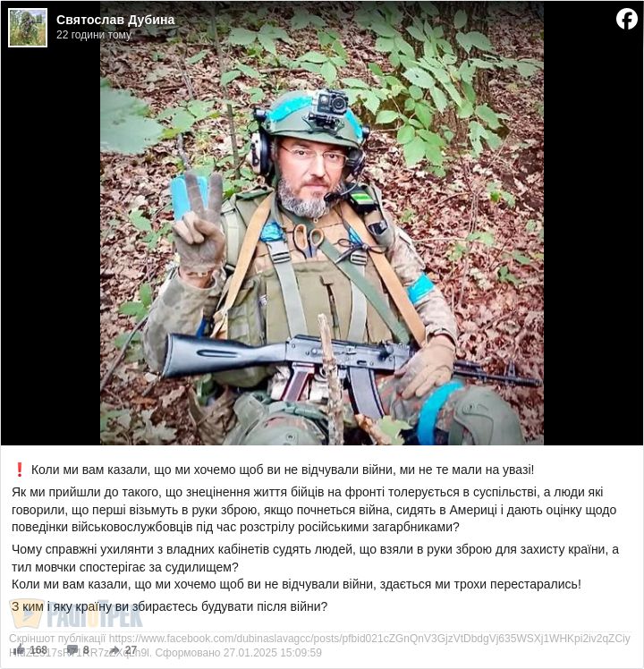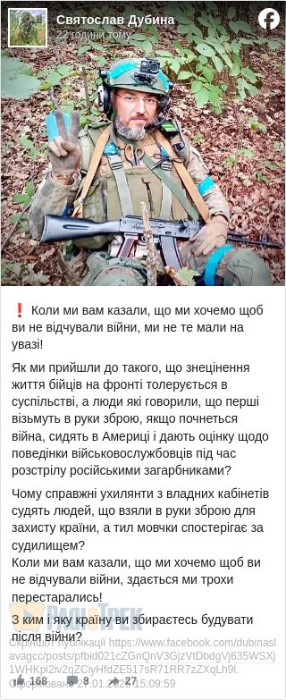 Як ми прийшли до такого, що знецінення життя бійців на фронті толерується в суспільстві, а люди які говорили, що перші візьмуть в руки зброю, якщо почнеться війна, сидять в Америці і дають оцінку щодо поведінки військовослужбовців під час розстрілу російськими загарбниками?